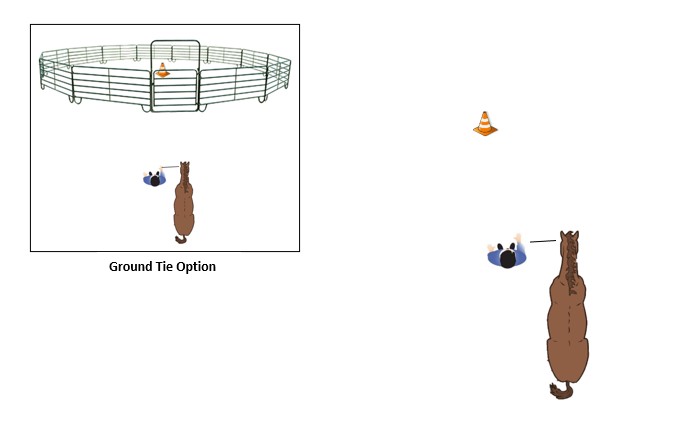 | 3 | Dismounted, from start cone, ground tie, pick up & check all 4 hooves and set hooves down. Exit. |