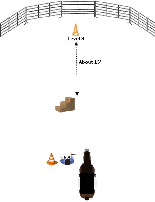 | 3 | FSC, with a halter on, ground tie equine at mounting block. Walk to cone, stand for 3 seconds. Walk in a circle around equine, sit on mounting block, while sitting, bridle your equine allowing your equine to lower its head. Exit. |